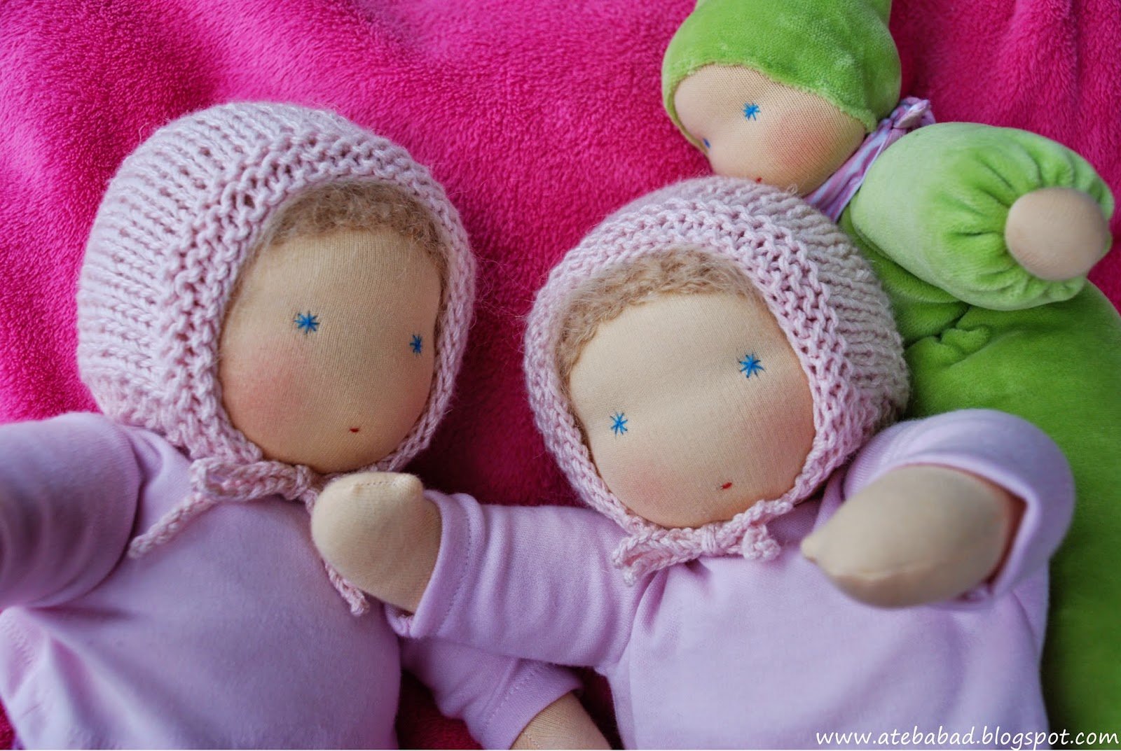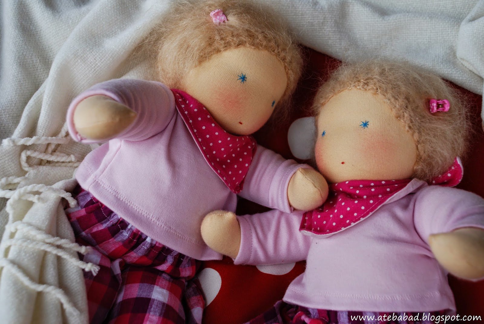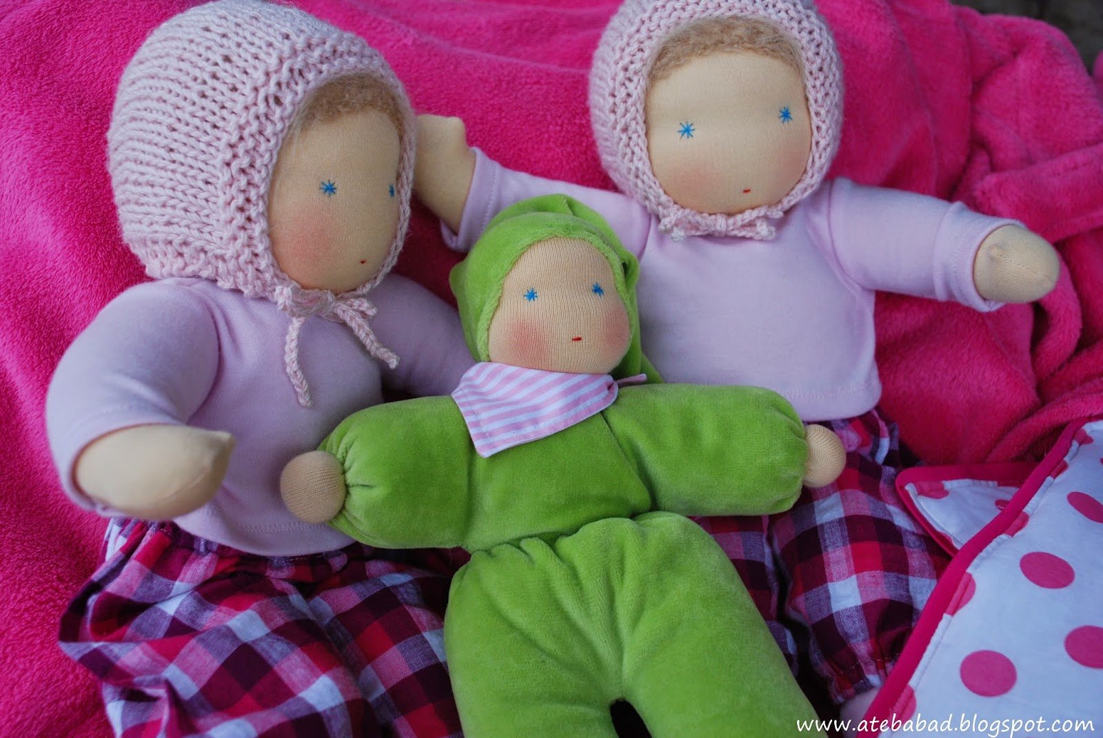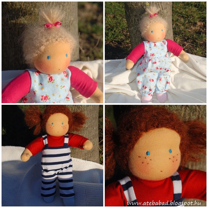 Johannának és Julinak, a 3 és 4 éves testvérkéknek készültek ezek a babák. Nem szoktam egyforma babákat varrni, a testvéri béke érdekében most mégis szükséges volt. 🙂 Így született meg Bori és Bogi, a csecsemő ikerpár, Zorka pedig az ő kishúguknak, Flórának.
